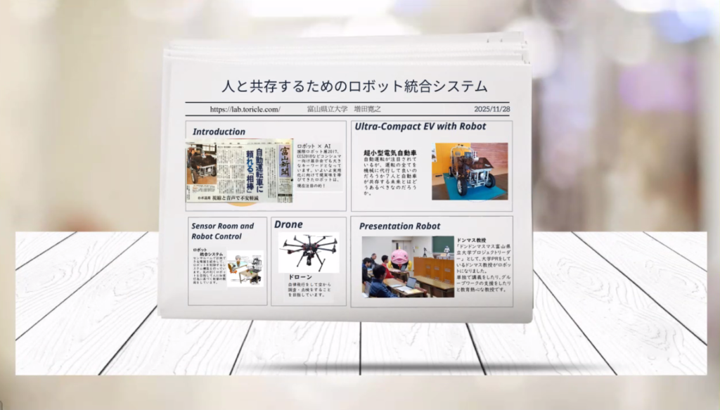 概要:教育支援ロボットと,屋内ドローンの自律航行システムを例に,汎用性を考慮したコミュニケーションとロボット制御に関したシステムについて紹介する.センサ,音声対話,環境理解を統合し,多様な状況で円滑に協働できる柔軟なシステム設計の事例について述べる.